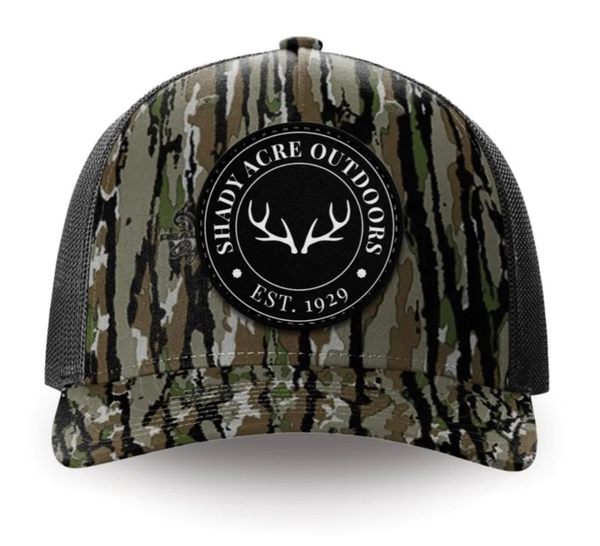 Richardson 112 snap back trucker hats with Realtree Edge or Realtree Original camo patterns with a leather Shady Acre Outdoors logo stitched front and center.